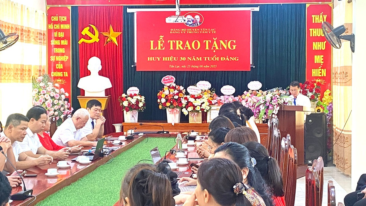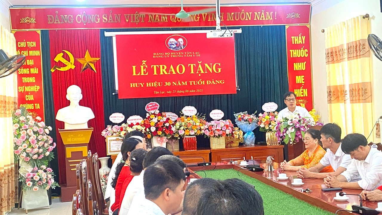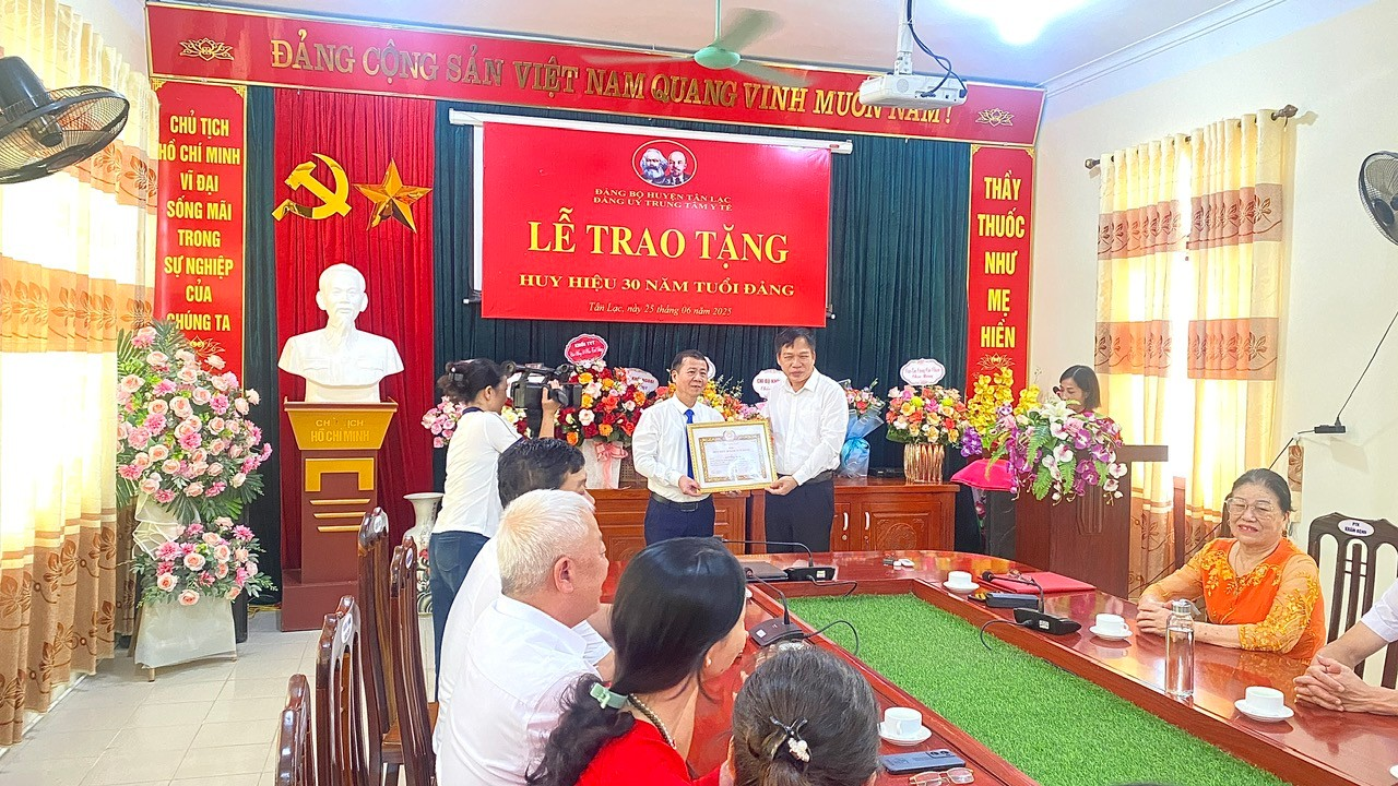 Chiều ngày 25/6/2025, Đảng bộ Trung tâm Y tế Tân Lạc long trọng tổ chức Lễ trao tặng Huy hiệu 30 năm tuổi Đảng cho đồng chí Trần Quốc Mạnh - Bí thư Đảng ủy, Giám đốc Trung tâm Y tế. Đây là sự kiện có ý nghĩa chính trị sâu sắc, thể hiện sự trân trọng, ghi nhận của Đảng đối với quá trình phấn đấu, rèn luyện, cống hiến bền bỉ của người đảng viên ưu tú trong suốt 30 năm qua.