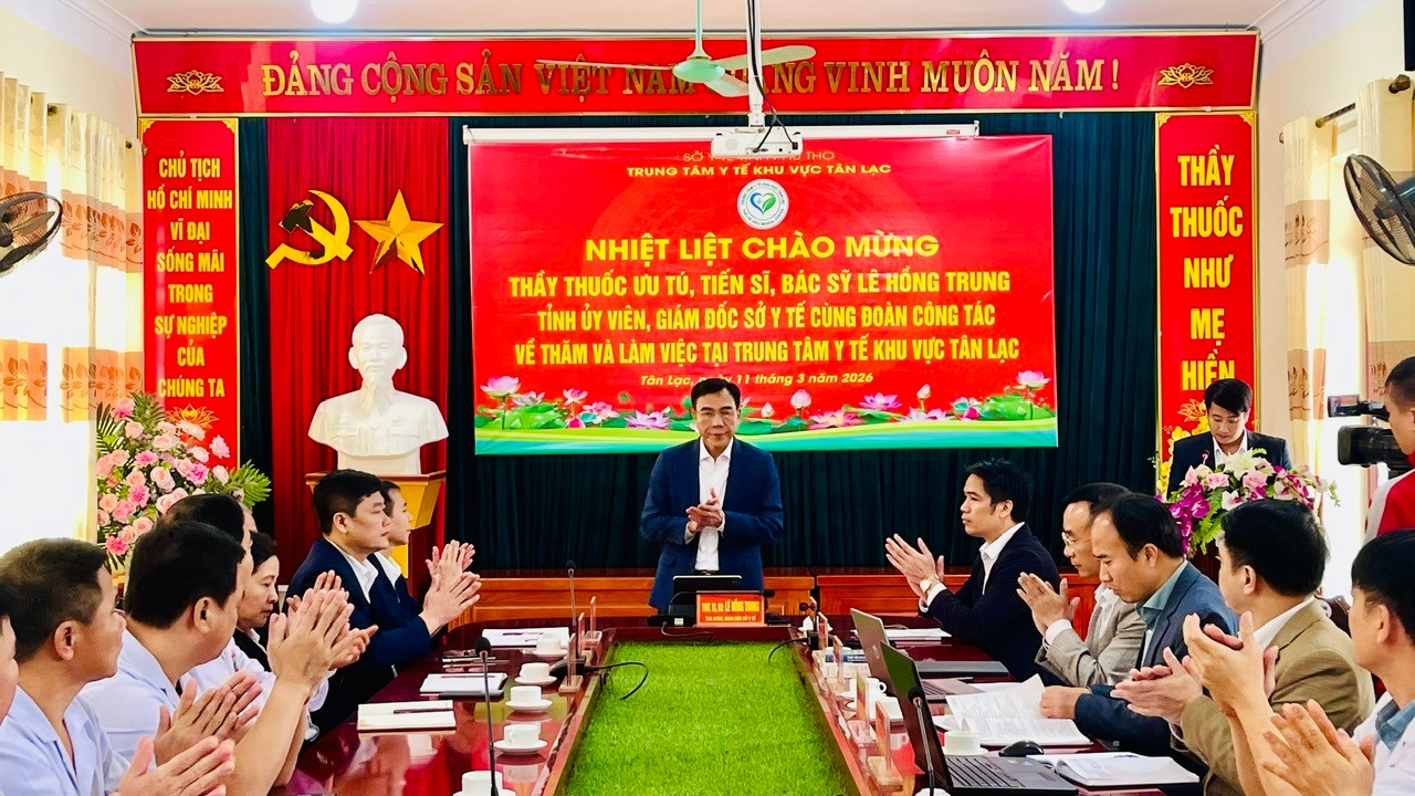 Sáng ngày 11/3/2026, đoàn công tác của Sở Y tế do ông Lê Hồng Trung - Tỉnh ủy viên, Giám đốc Sở Y tế làm trưởng đoàn đã có buổi làm việc với Trung tâm Y tế khu vực Tân Lạc nhằm đánh giá tình hình thực hiện nhiệm vụ và định hướng một số nhiệm vụ trọng tâm trong thời gian tới.