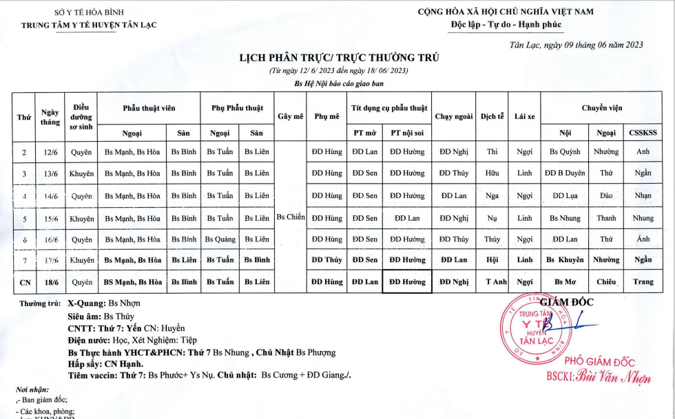 Lịch trực tuần 12 - 18/06/2023