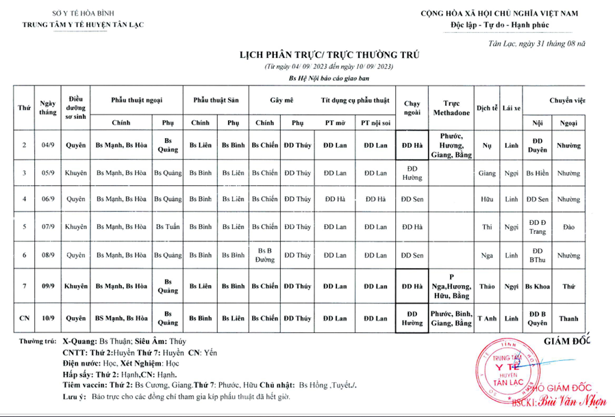 Lịch trực tuần 4/9 - 10/9/2023