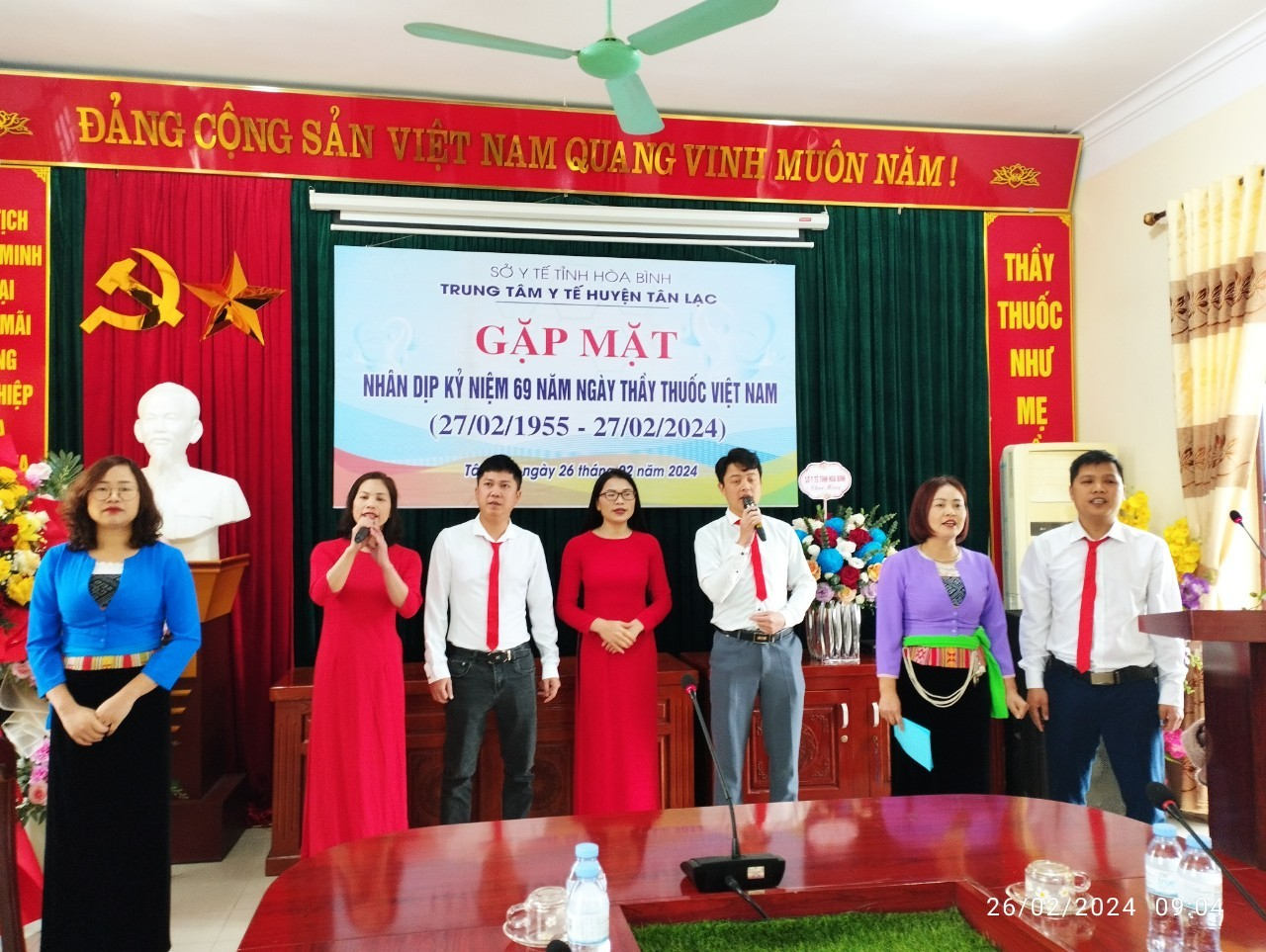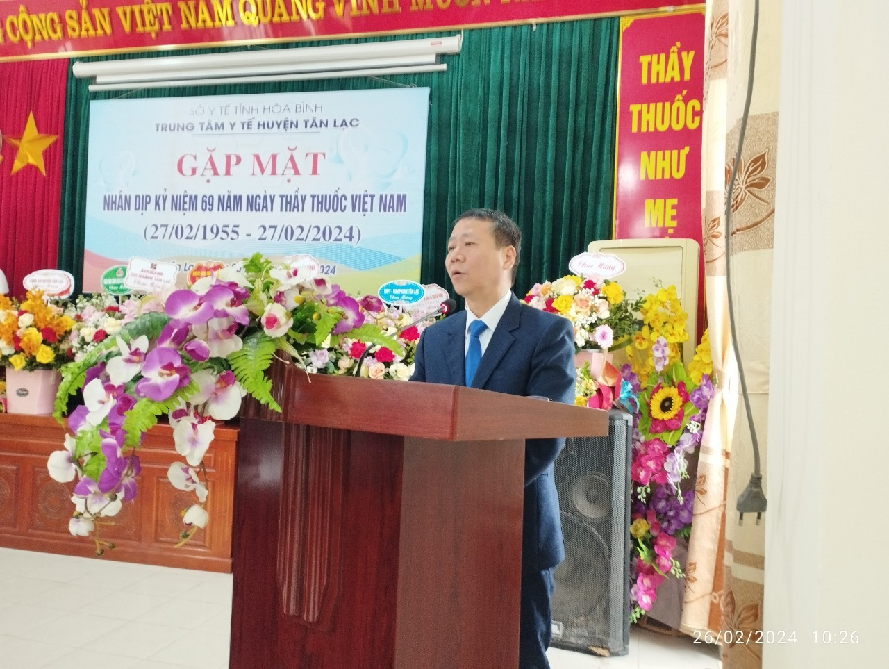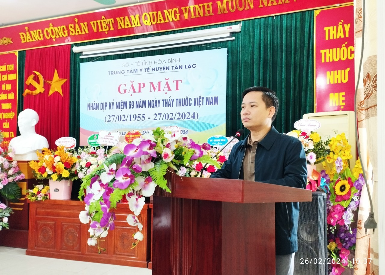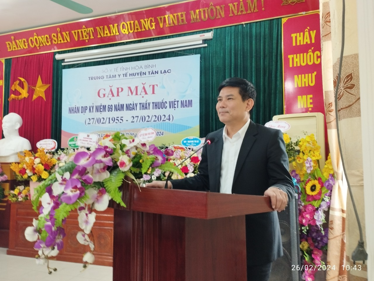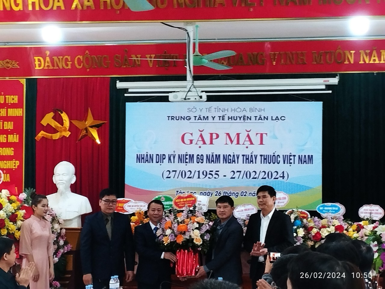 Sáng ngày 26/02/2024 Trung tâm Y tế huyện Tân Lạc long trọng tổ chức gặp mặt nhân dịp kỷ niệm 69 năm ngày Thầy thuốc Việt Nam (27/2/1955-27/2/2024). Tới dự, động viên có các đồng chí: Đ/c Nguyễn Quốc Tiến - Phó Giám đốc Sở Y tế, Đồng chí Lê Chí Huyên - Ủy viên Ban Thường vụ huyện Ủy - Phó chủ tịch UBND huyện, Phụ trách Đảng Bộ; Các đồng chí Ủy viên BTV Huyện ủy, trưởng các phòng, ban, ngành, đoàn thể huyện; Các đồng chí nguyên là lãnh đạo ngành y tế qua các thời kỳ