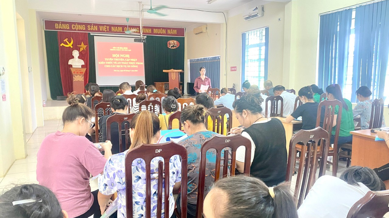 Nhằm nâng cao nhận thức, trách nhiệm của các cơ sở sản xuất, kinh doanh dịch vụ ăn uống, bếp ăn tập thể, thức ăn đường phố trên địa bàn huyện. Khoa Y tế công cộng - An toàn thực phẩm & dinh dưỡng Trung tâm Y tế huyện Tân Lạc vừa tổ chức Hội nghị tuyên truyền, cập nhật kiến thức về an toàn thực phẩm cho các cơ sở sản xuất, kinh doanh dịch vụ ăn uống, bếp ăn tập thể, thức ăn đường phố trên địa bàn huyện.