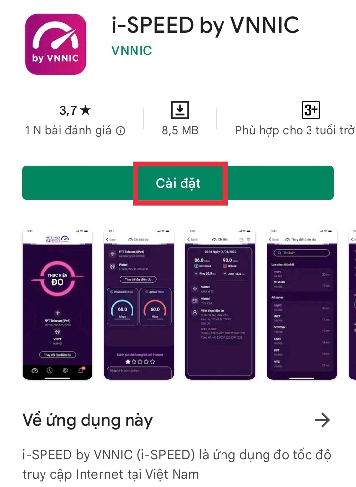 Truy nhập CH Play/Google PlayStore Tìm ứng dụng: i-Speed hoặc i-Speed by VNNIC Sau đó nhấn nút “Cài đặt”