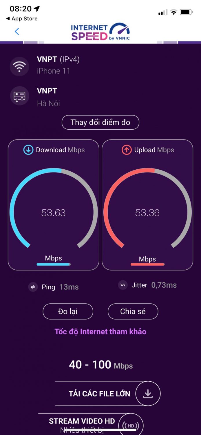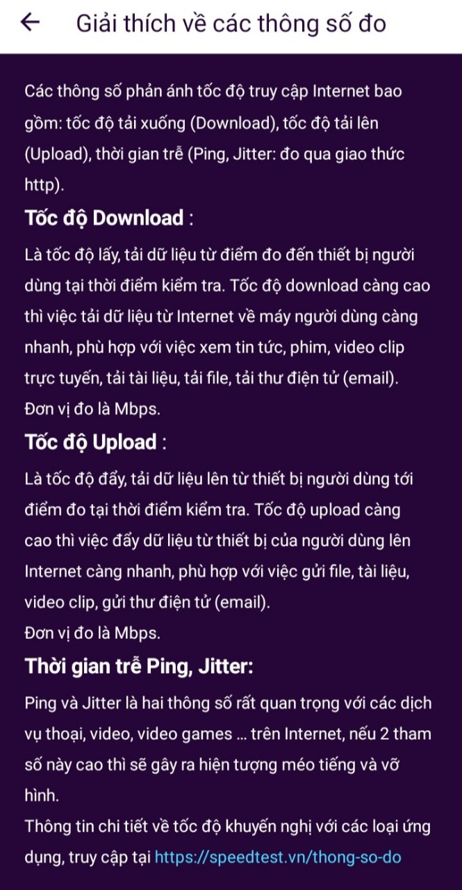 Các thông số về tốc độ truy cập Internet bao gồm tốc độ tải xuống (Download), tốc độ tải lên (Upload), độ trễ (Ping. Jitter)