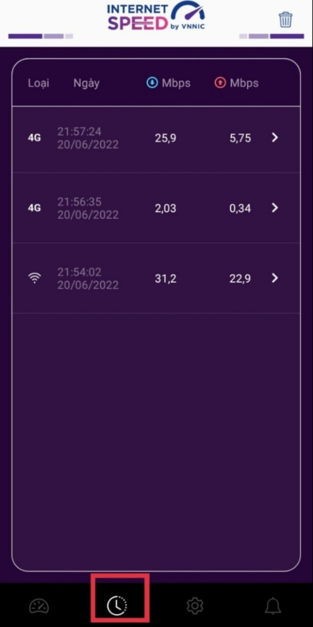 Người dùng vào phần lịch sử đo -> vào Menu lịch sử đo, ứng dụng cho phép xem lại lịch sử mọi quá trình đo tốc độ từ khi bắt đầu sử dụng.