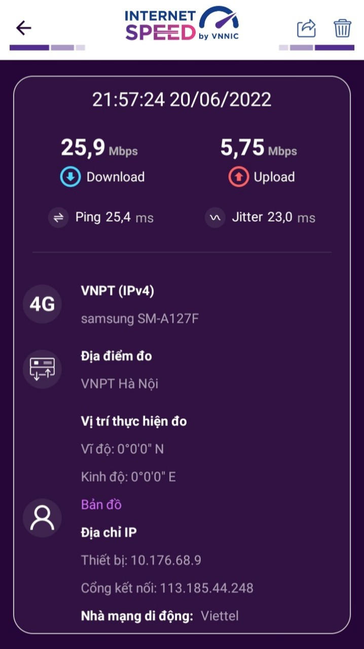 Click vào kết quả để xem chi tiết các thông số như: tốc độ download, upload, độ trễ, nhà mạng, địa chỉ IP, vị trí thực hiện đo,...