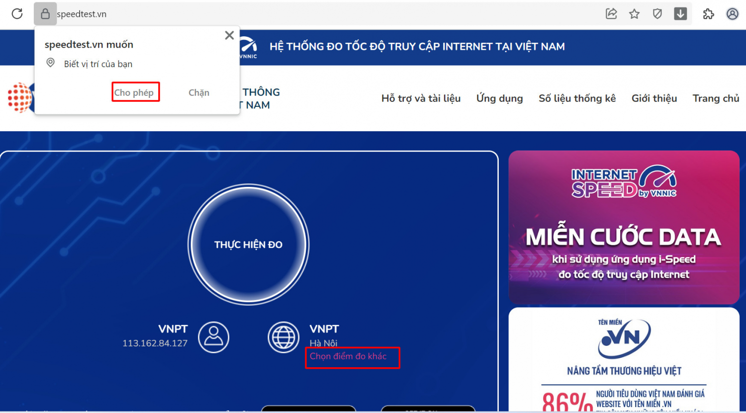 Bước 2: Chọn “Thay đổi điểm đo”: Chọn server điểm đo của hệ thống; lựa chọn điểm đo gần với người dùng nhất để có kết quả đo chính xác nhất.