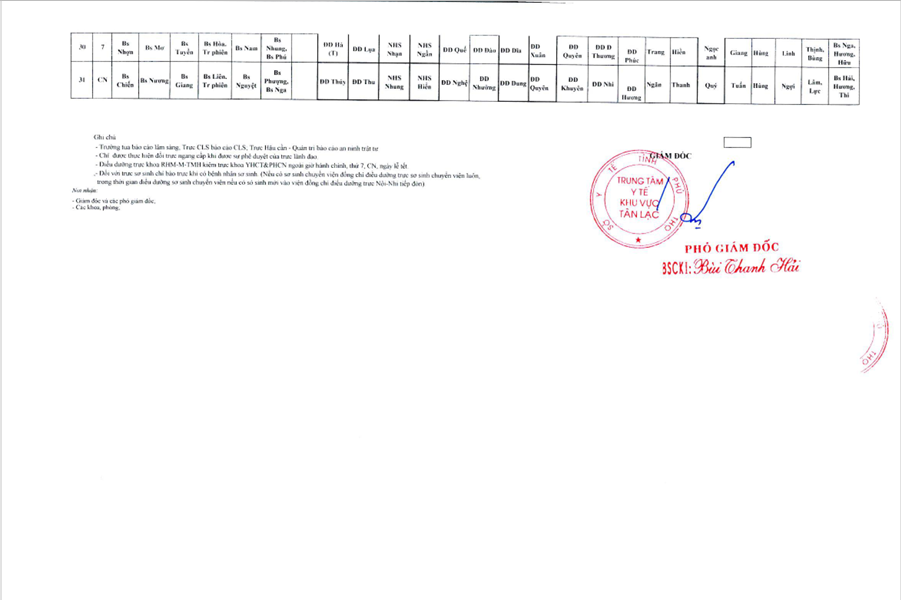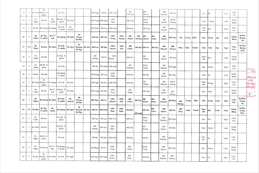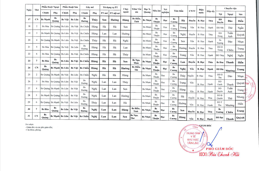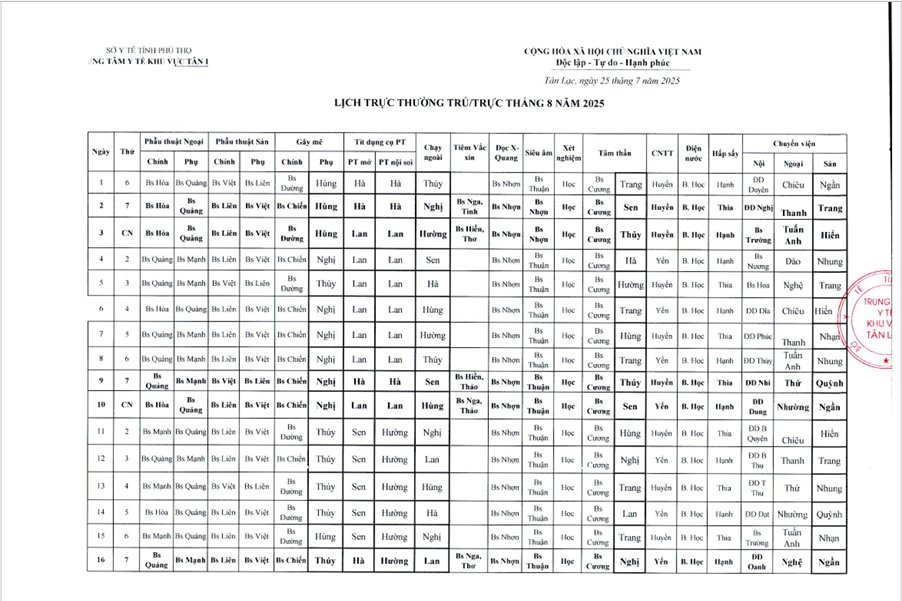 Lịch trực tháng 8/2025