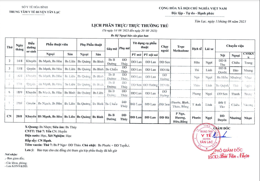 Lịch trực tuần 14 -20/08/2023