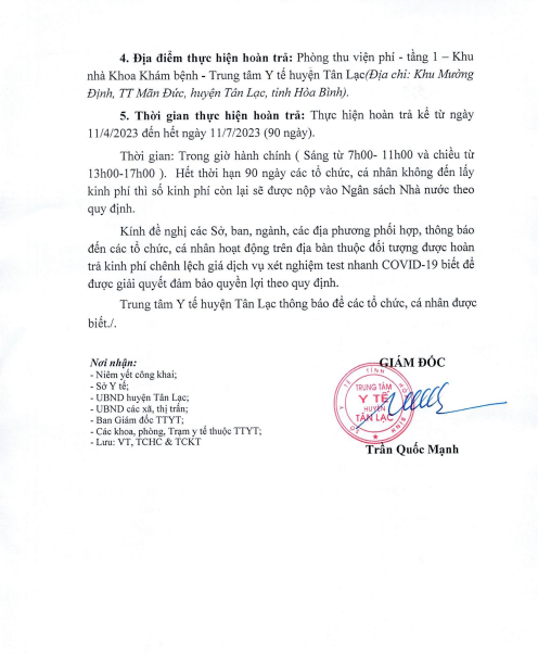 THÔNG BÁO VÀ DANH SÁCH HOÀN TRẢ LẠI TIỀN THU DV TEST COVID