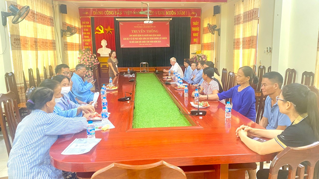 Ngày 06/09/2024, Trung tâm Y tế huyện Tân Lạc, đã tổ chức Hội nghị Truyền thông về “Phát hiện sớm bệnh không lây nhiễm và rối loạn sức khỏe tâm thần”. Do Báo cáo viên của Trung tâm Y tế trực tiếp truyền đạt nội dung tại Hội nghị. Hội nghị với sự tham gia của đông đảo người bệnh, người nhà bệnh nhân và cán bộ y tế.